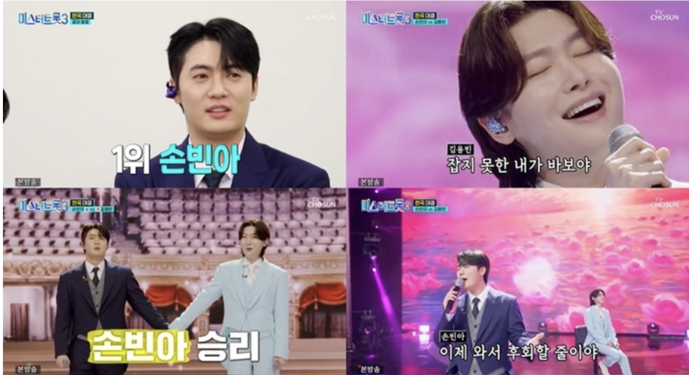 - 김용빈 vs 손빈아: “미리 보는 결승전”이라는 말이 나올 정도로 강력한 우승 후보인 두 사람이 한 곡 대결로 맞붙었고, 결과는 손빈아의 근소한 우세였습니다. 하지만 김용빈이 온라인 투표에서 만점(1위)을 획득하면서 최종 합산 순위는 또 다른 양상을 띠었습니다.