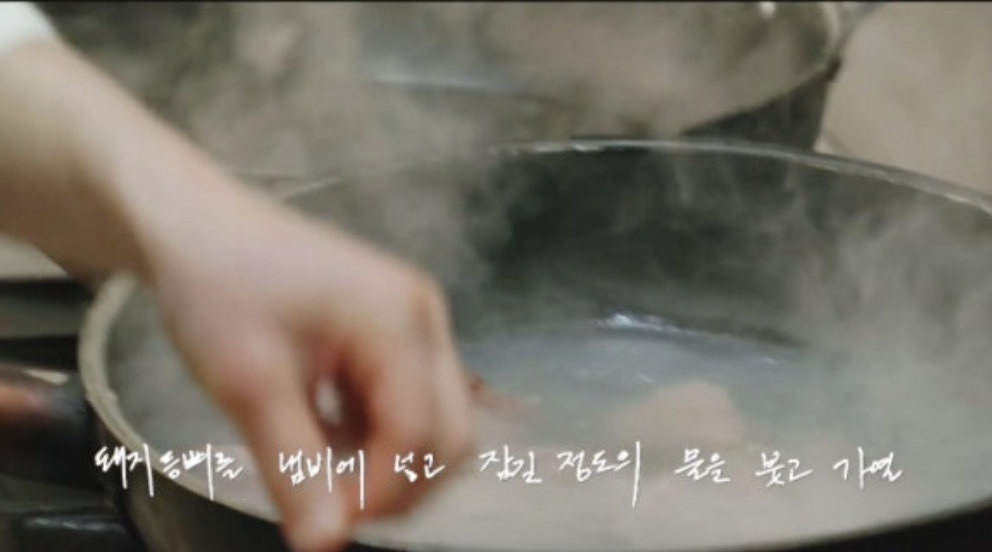 돼지 등뼈를 찬물에 담가 핏물을 뺀 뒤, 냄비에 넣고 물을 부어 한소끔 끓입니다.
