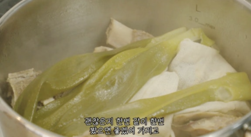중간중간 거품과 기름기를 걷어내 주면 국물의 색과 맛이 더욱 깔끔해집니다